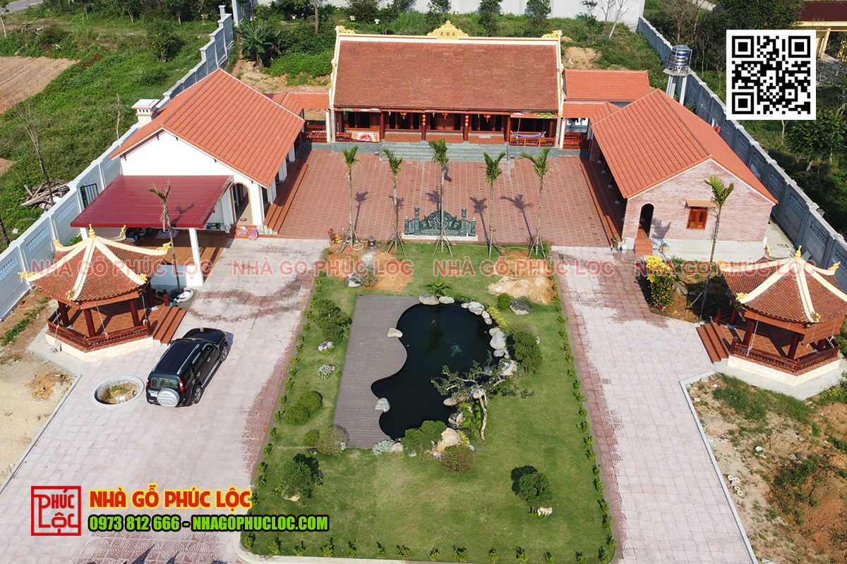 • Ngôi nhà gỗ có thể là 3 gian hoặc 5 gian được xây dựng ở vị trí đắc địa, xung quanh là phần sân vườn rộng lớn, được chăm sóc tỉ mỉ, với những hàng cây xanh mát, hồ cá, hòn non bộ,… tạo nên tổng thể khuôn viên sang trọng, tinh tế.